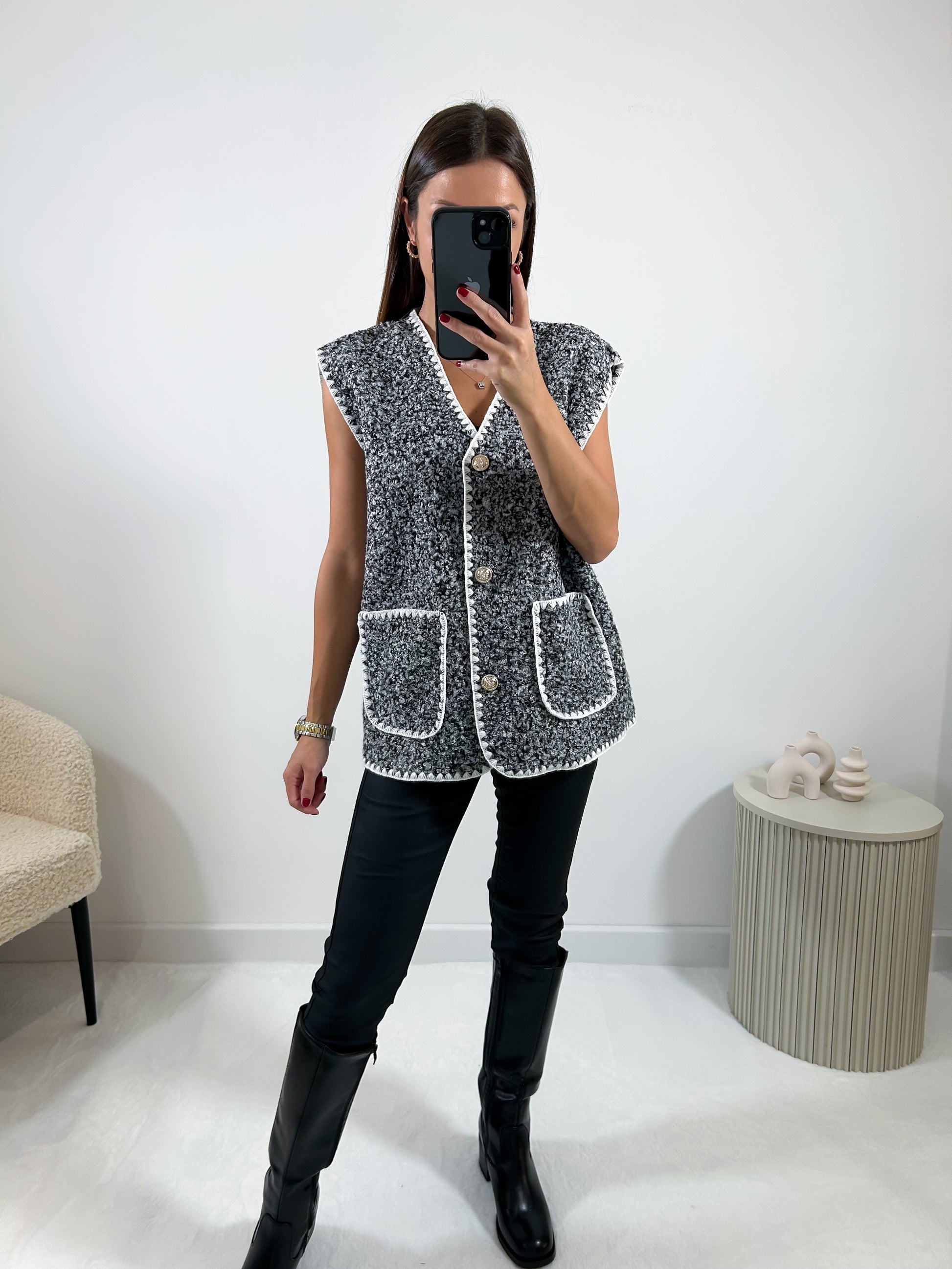 • Gilet effet bouclé avec poches et boutons dorés
